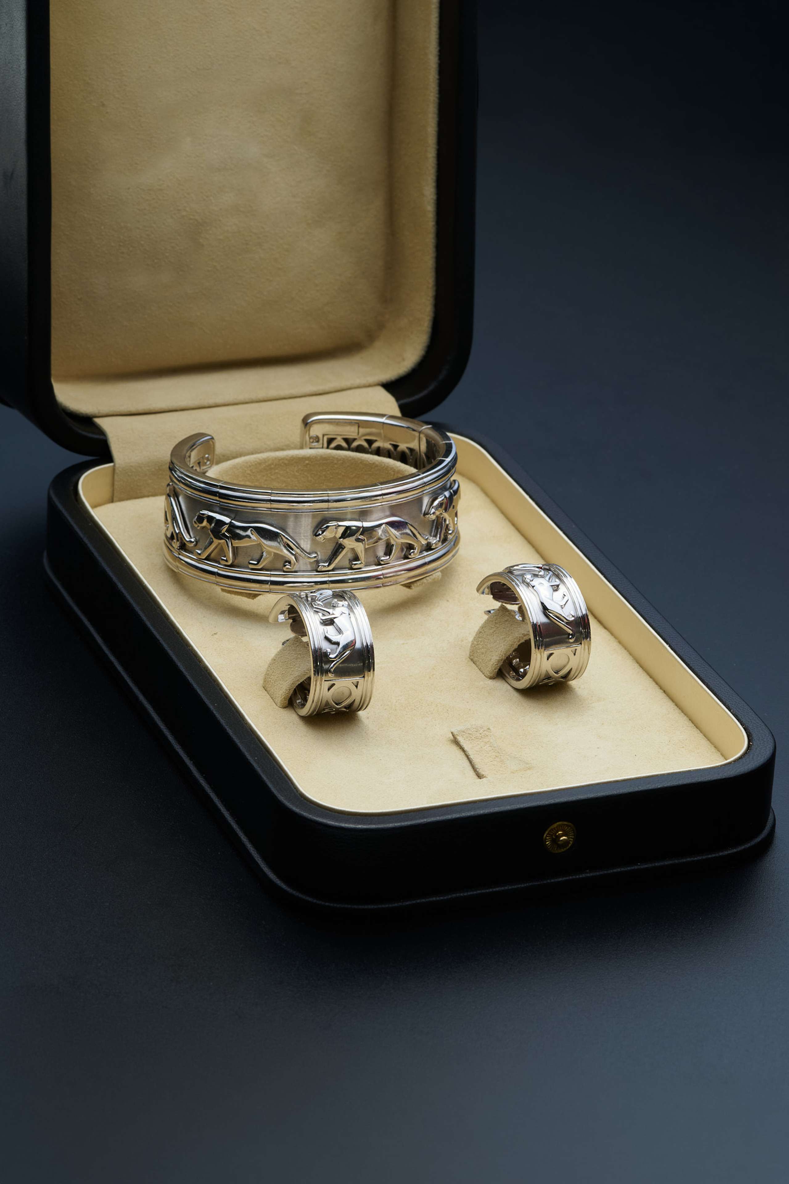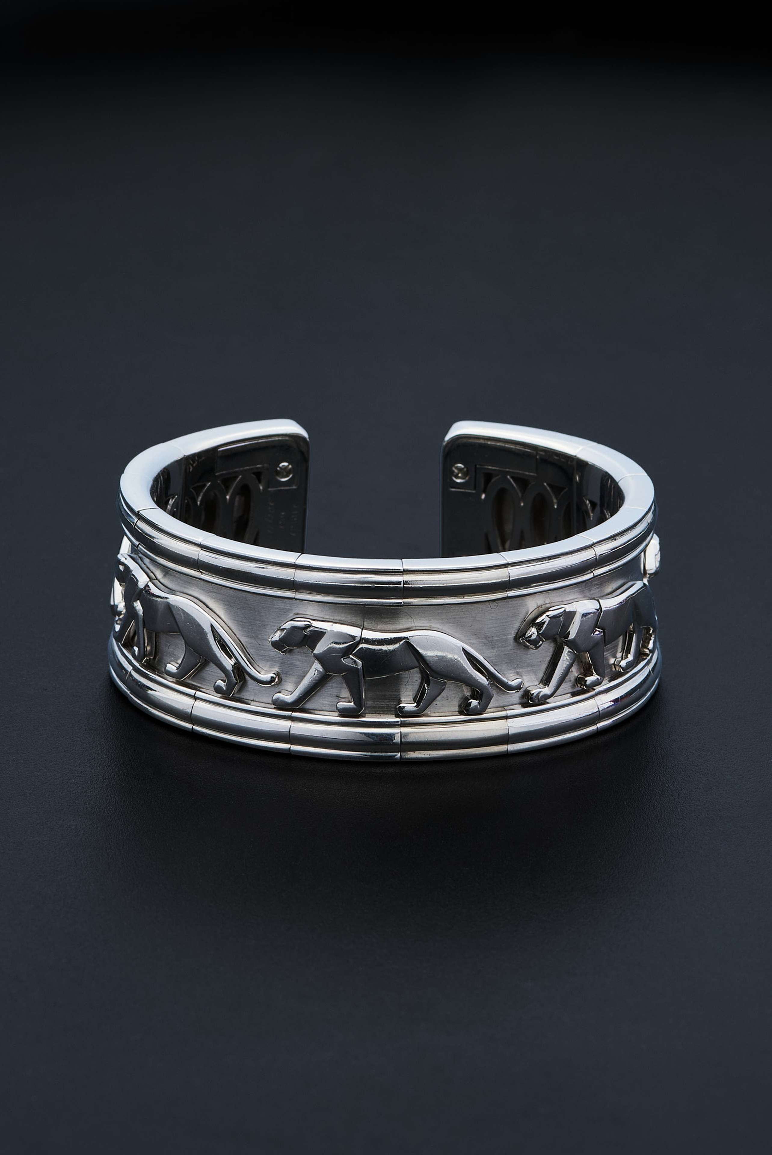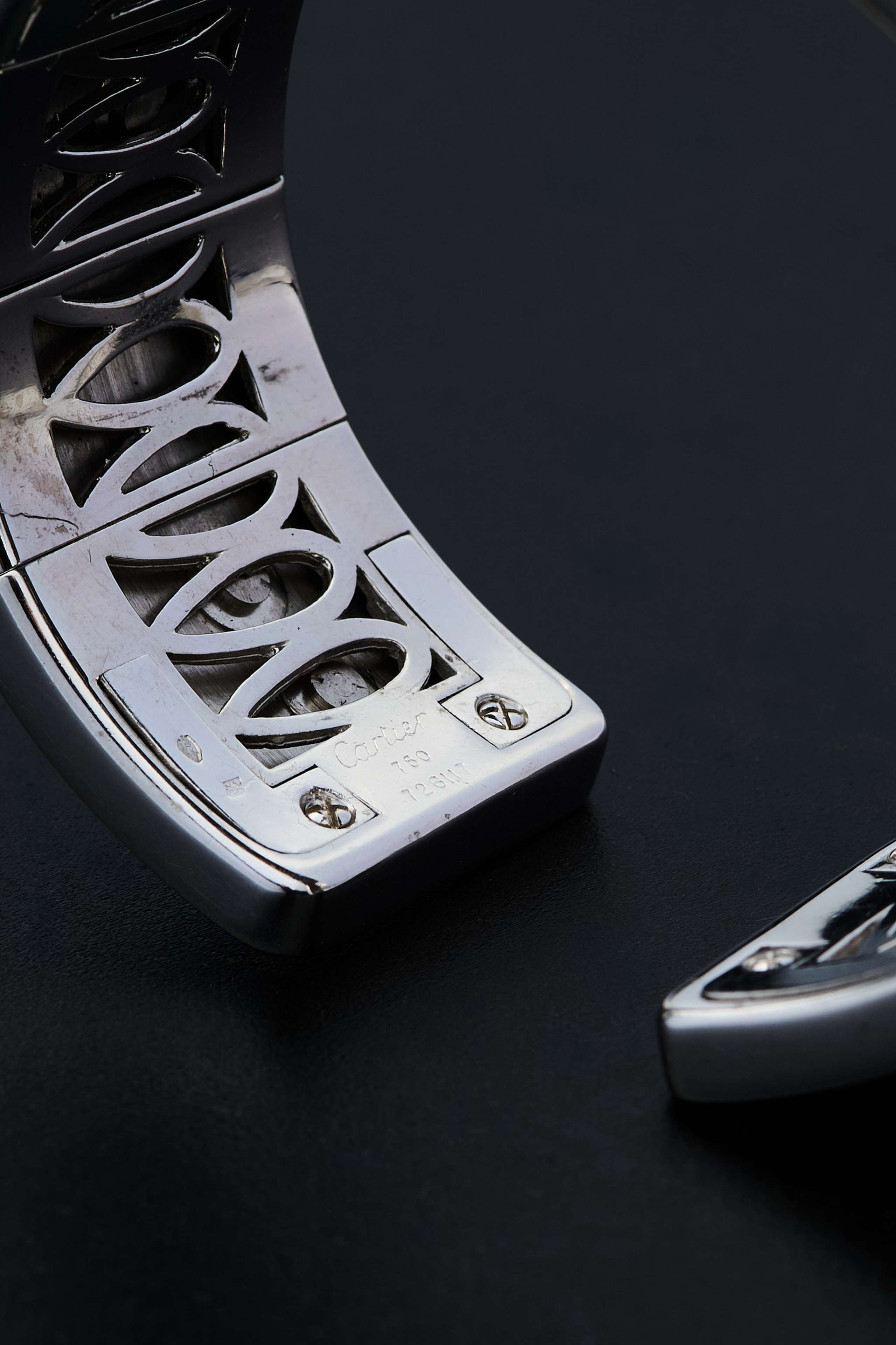 Vintage Cartier bracelet, "Egypt" collection, 1989, inwhite gold. The French hallmarks of Paris (eagle's head), the gold fineness (750), and the jeweler's signature are clearly visible on both the bracelet and each earring. Weight of the bracelet 106,25 gr., weight of the single earring 22,00 gr. Thickness 2,3cm, inside diameter 5,8cm. "Eagle's head" hallmark: Adopted by the Paris Assurance Office to mark small gold objects manufactured in France for domestic sale. It guarantees the minimum legal fineness of 750 thousandths (18kt).