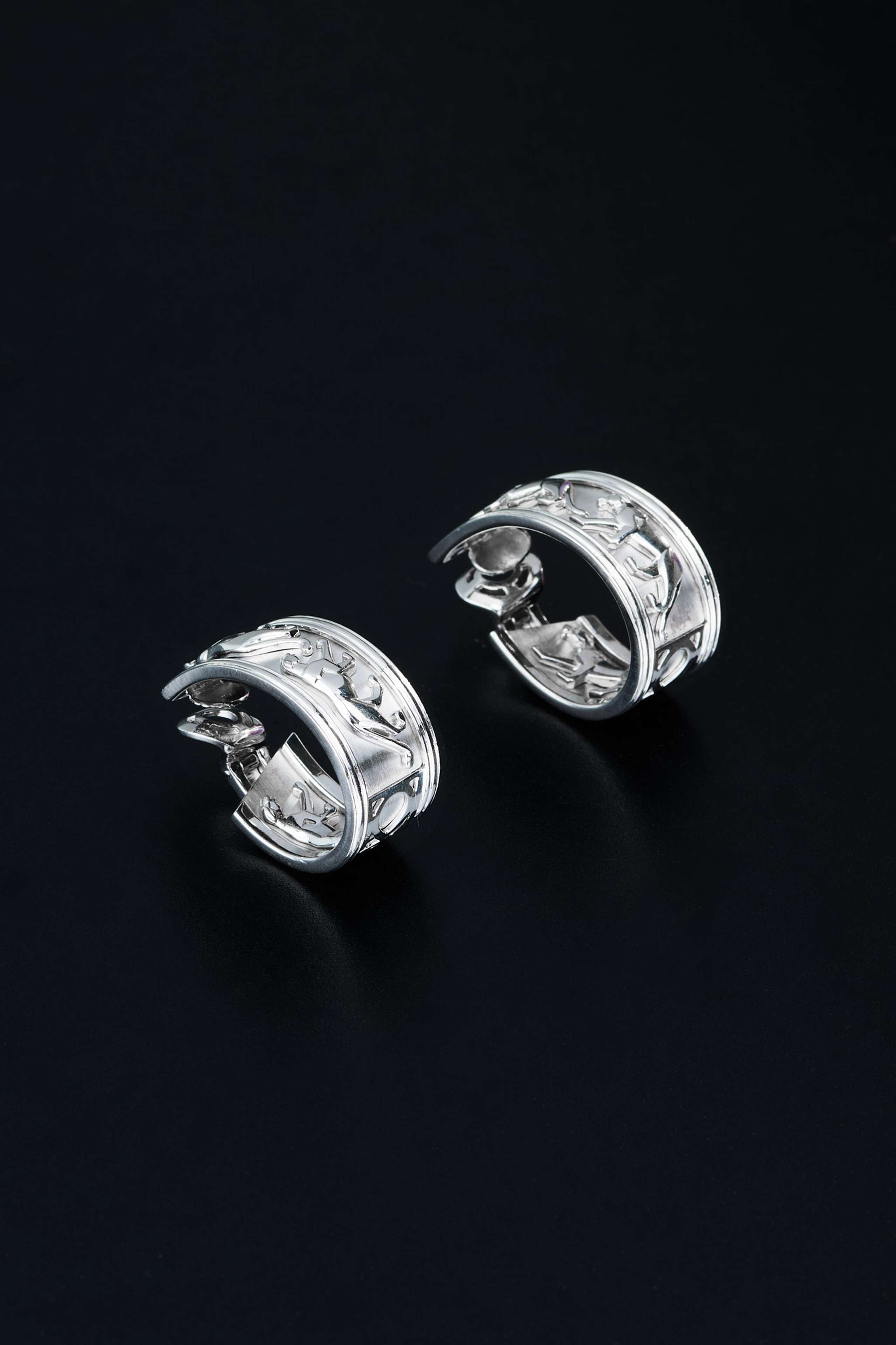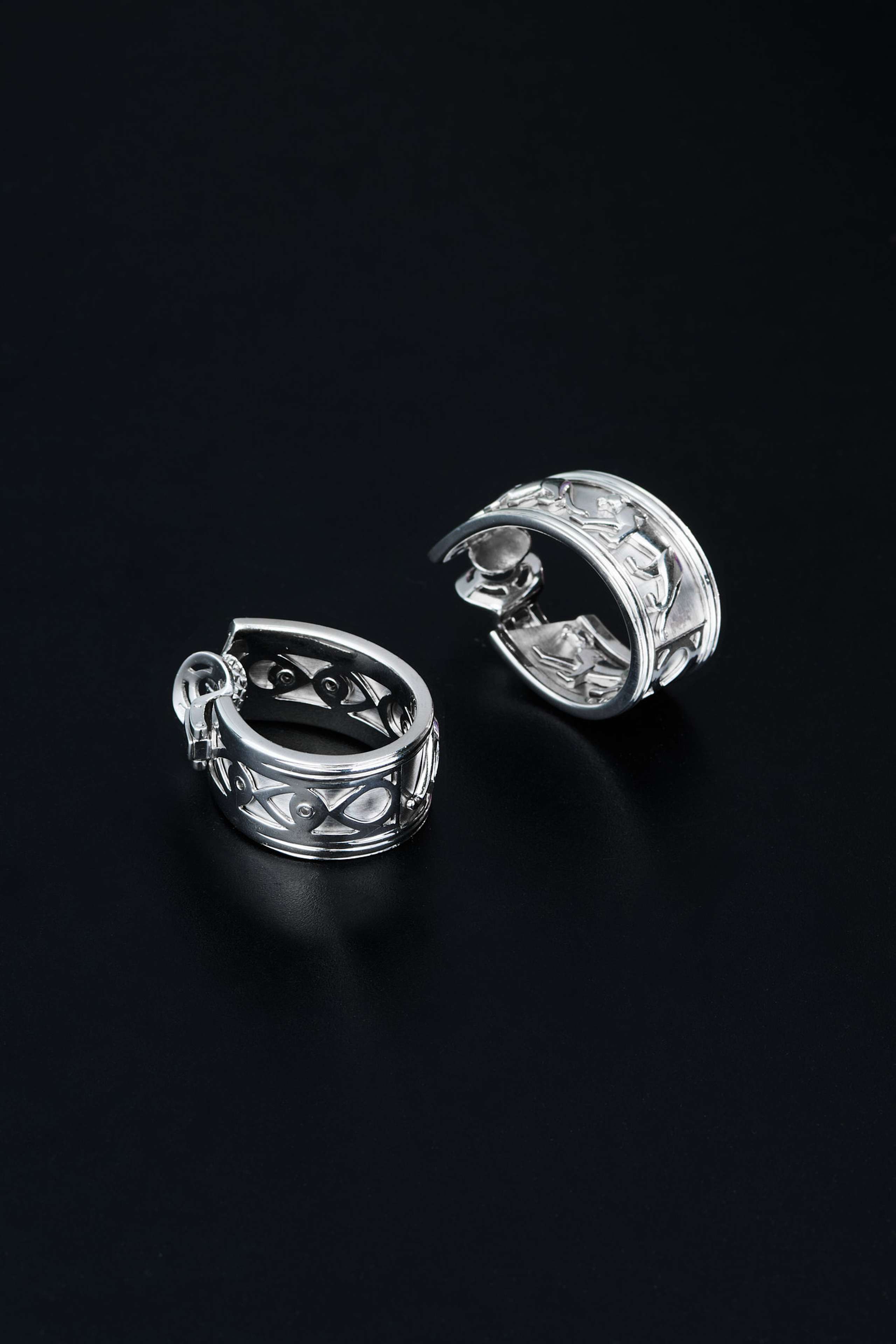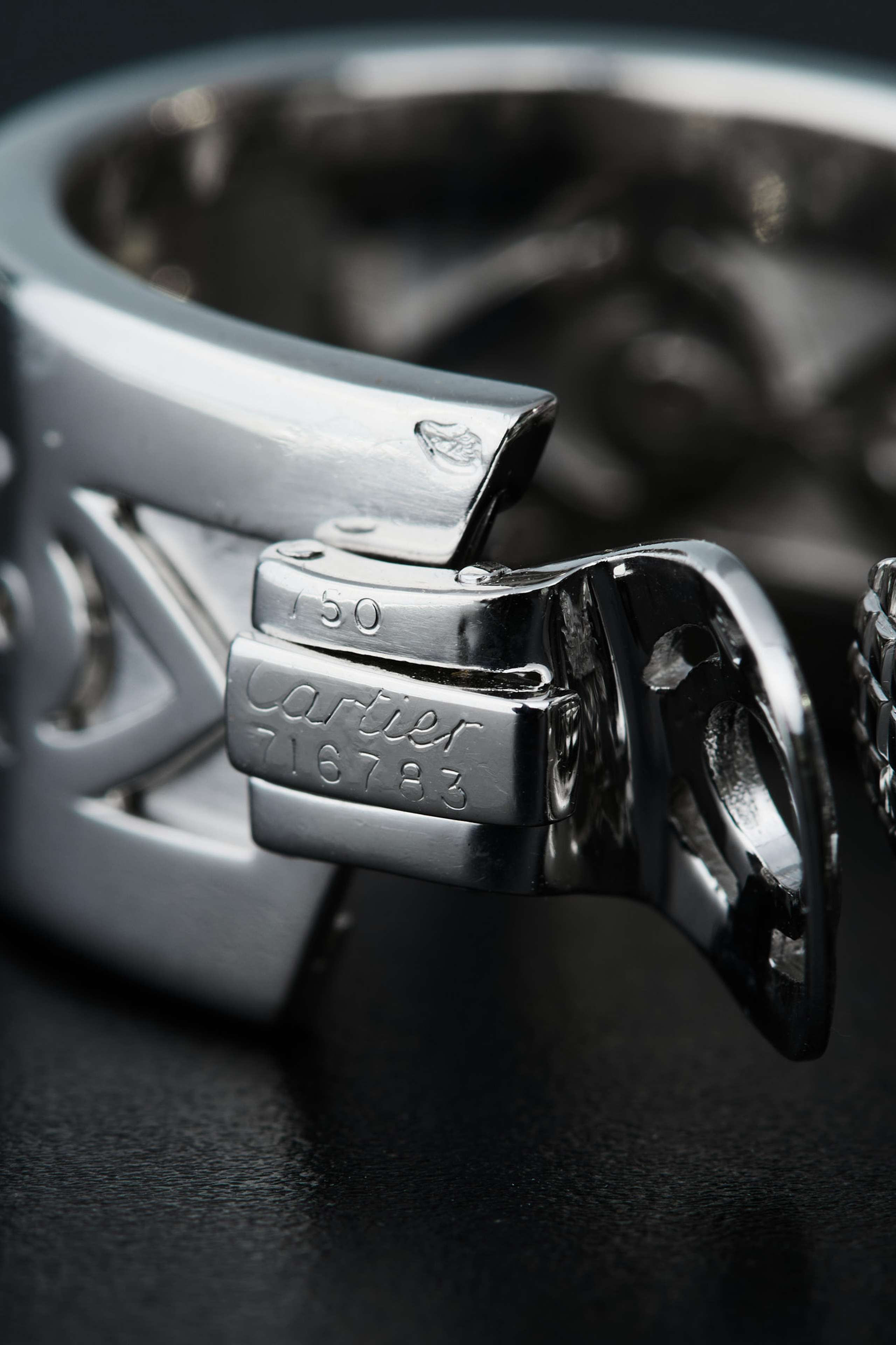 Vintage Cartier bracelet, "Egypt" collection, 1989, inwhite gold. The French hallmarks of Paris (eagle's head), the gold fineness (750), and the jeweler's signature are clearly visible on both the bracelet and each earring. Weight of the bracelet 106,25 gr., weight of the single earring 22,00 gr. Thickness 2,3cm, inside diameter 5,8cm. "Eagle's head" hallmark: Adopted by the Paris Assurance Office to mark small gold objects manufactured in France for domestic sale. It guarantees the minimum legal fineness of 750 thousandths (18kt).